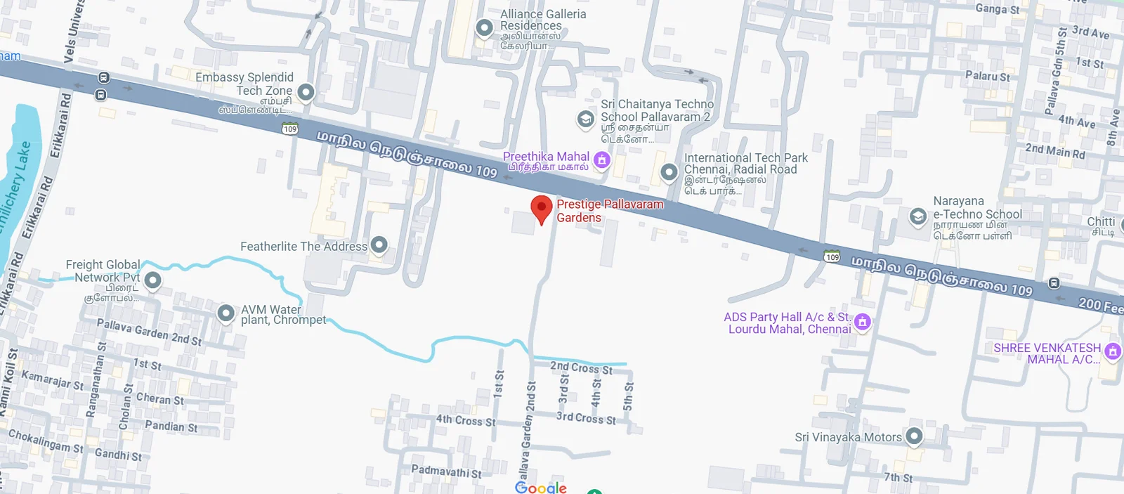 Prestige Pallavaram Gardens is an expansive 21.84-acre luxury residential development located on the 200 Ft Radial Road, Pallavaram-Thuraipakkam Road, Nemilichery, Chennai. Comprising 2069 elegantly designed apartments across 13 towers (2B + G + 14 floors), the project offers spacious 2, 3, and 4 BHK homes ranging from 1001 to 2750 sq.ft. Prices start at ₹1.2 Cr for 2 BHK, ₹1.55 Cr for 3 BHK, and ₹3 Cr for 4 BHK units. Residents will enjoy world-class amenities, including a massive 65,000 sq.ft. clubhouse, swimming pool, gym, yoga pavilion, biometric access, video door phone, CCTV surveillance, and 24/7 security. Strategically located just 5.5 km from Chennai International Airport and close to major IT hubs like Embassy TechZone and CapitaLand, the project ensures seamless connectivity. With metro stations nearby and RERA approval (TN/35/Building/0224/2025), Possession is scheduled for December 2029.